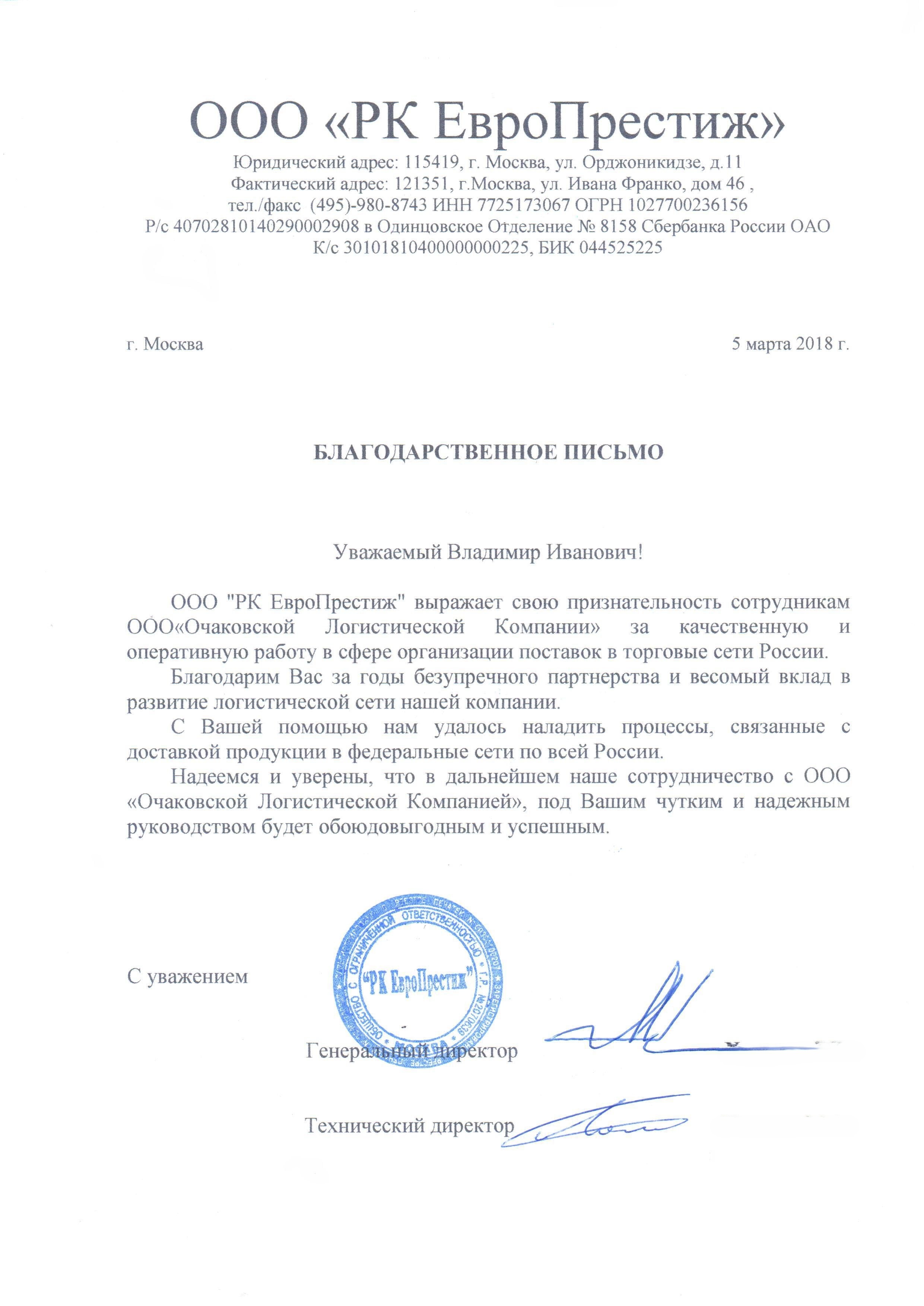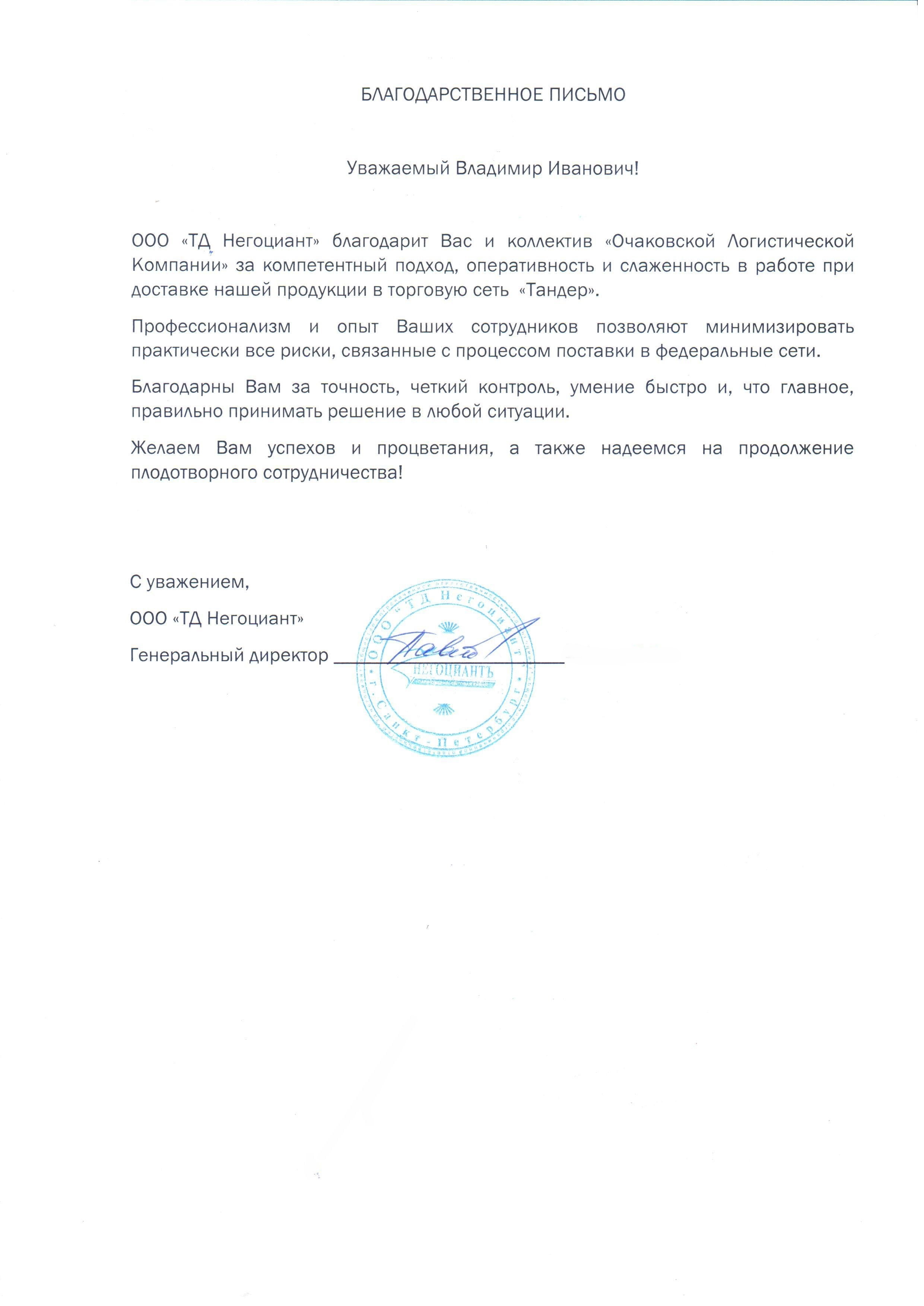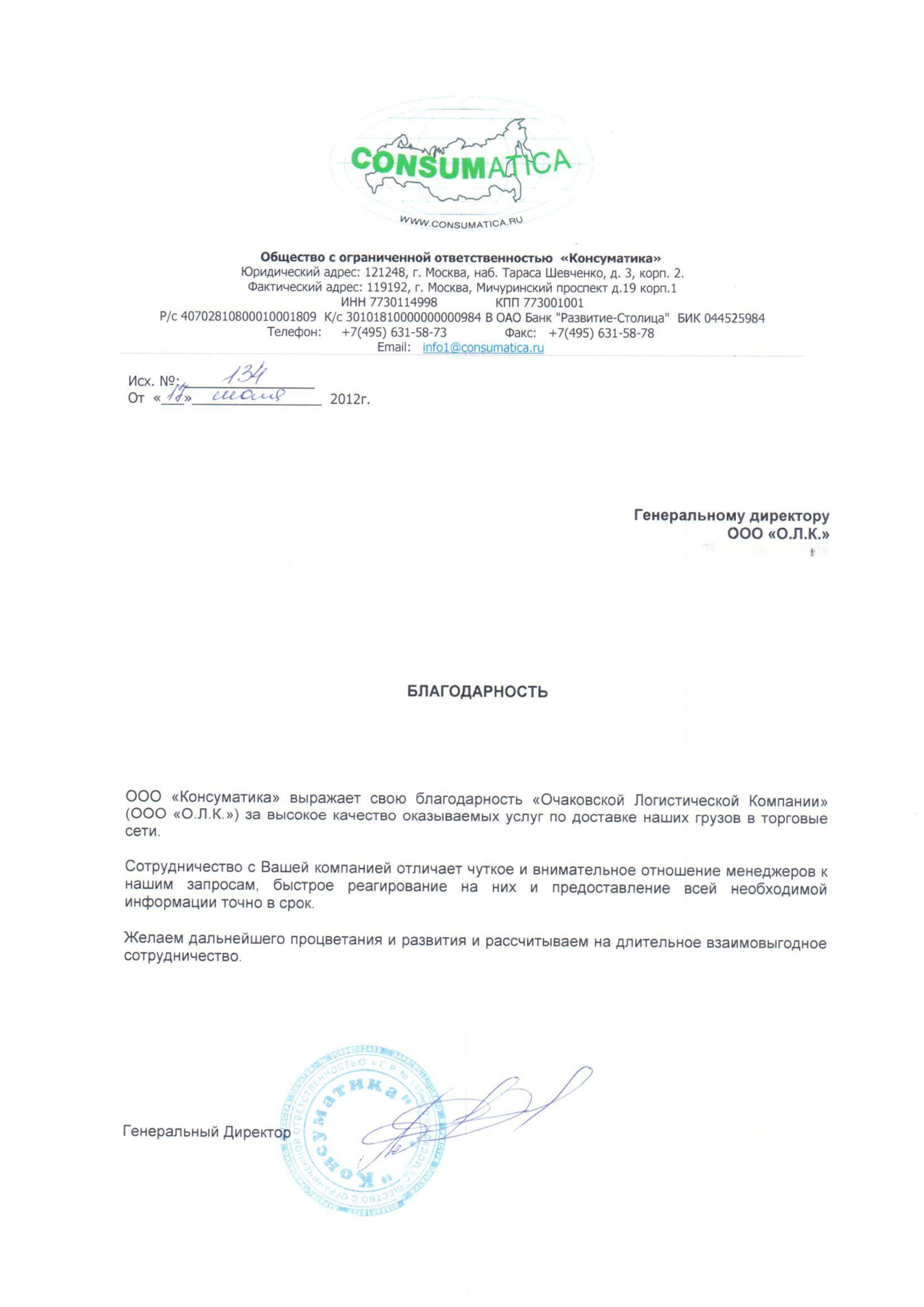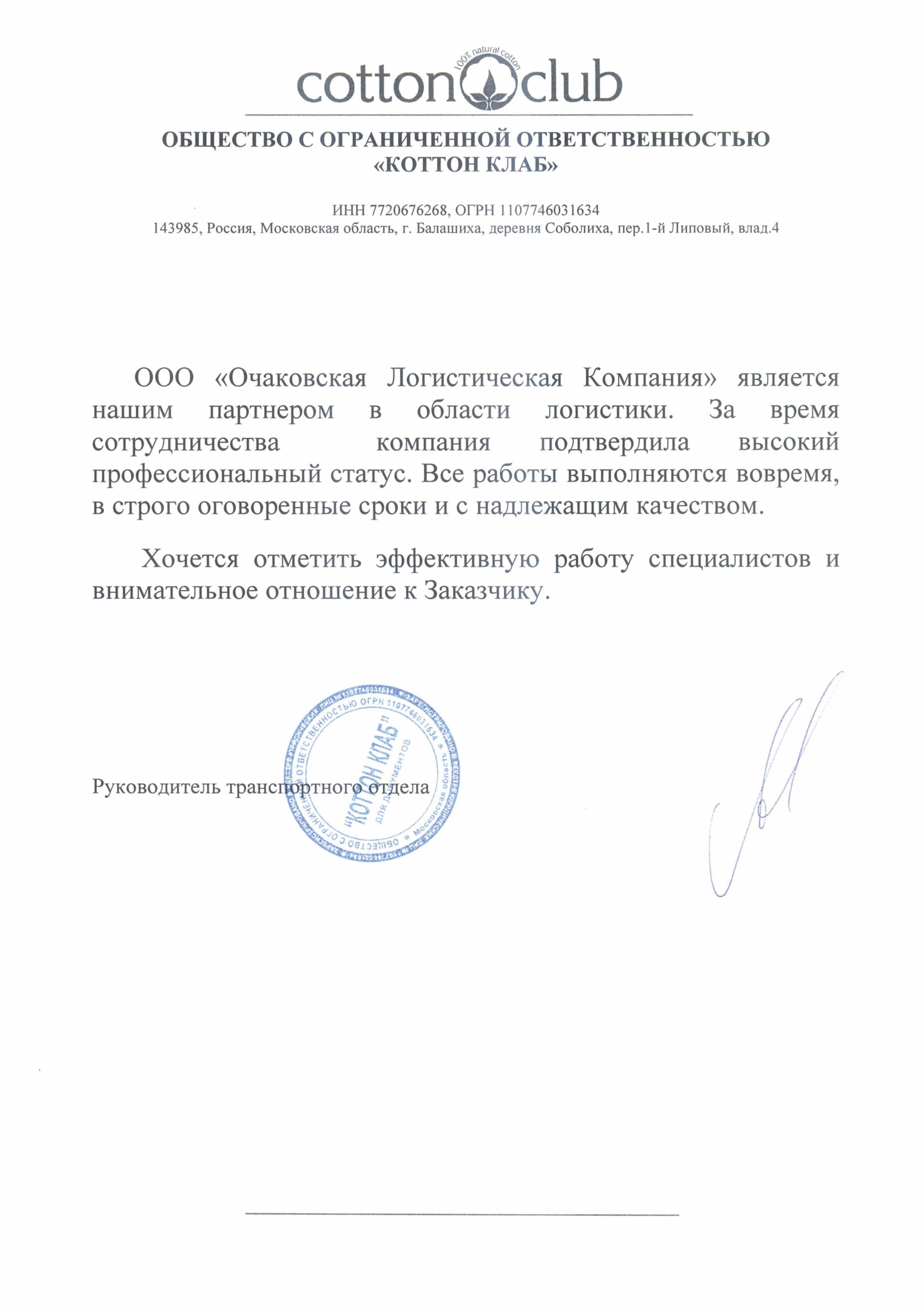 "В 2015 году через партнеров узнали об «О.Л.К.». Нам нужна была транспортная компания для доставки в Торговые сети. За все эти года не было ни одной претензии к ним. Ответственная, добросовестная компания, делают все и даже больше. Очень большой плюс то, что "О.Л.К." предоставляет личного менеджера. Рекомендуем 100%."
